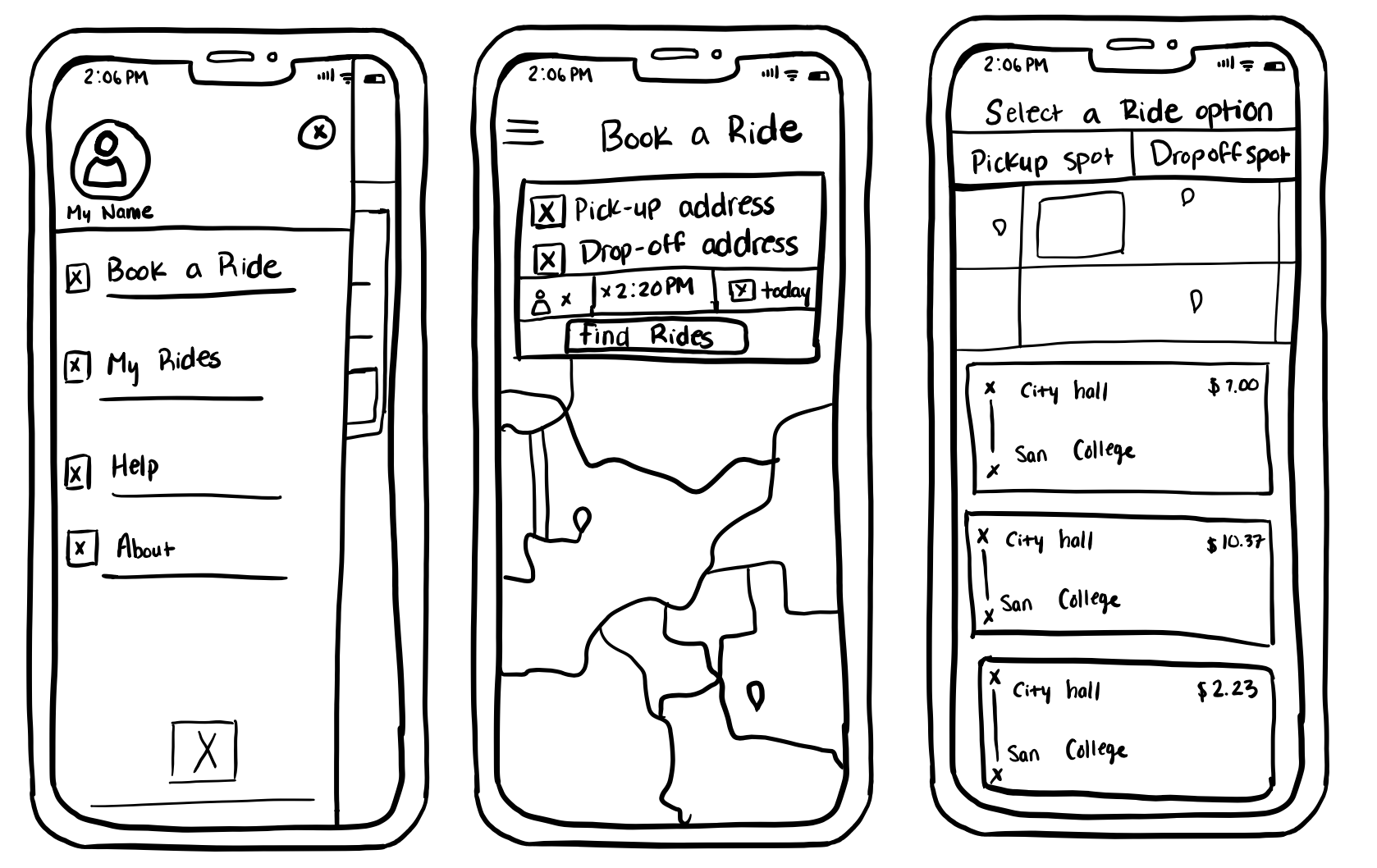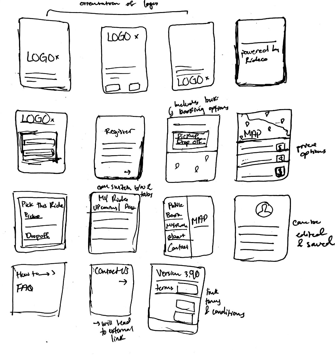 Rapid sketching allowed me to explore design patterns common among apps in the competitive landscape, helping me understand which needed to carry over into Rideco clients to ensure familiarity. This also helped identify screen types that could serve multiple functions, as well as swiping/touch gestures that would likely be the most intuitive.